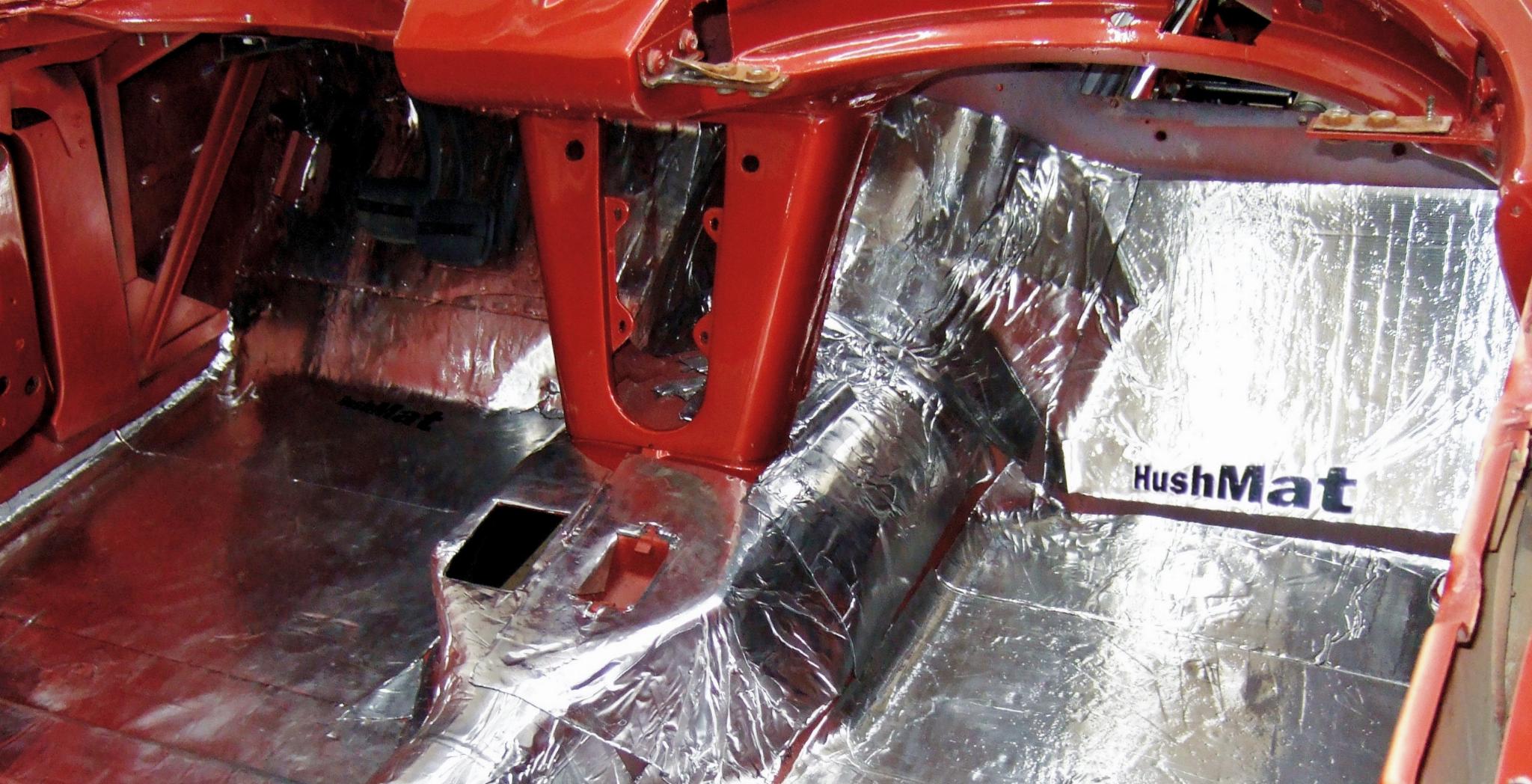 For extra thermal protection apply ½” Silencer Megabond directly on top of HushMat Ultra on the firewall, tunnel and trunk floor for optimum thermal insulating performance. Apply ¼” Silencer Megabond to the back of the headliner for extra insulation from the radiant heat. Call or e-mail us and we can provide you with the best material for these applications. HushMat Ultra is specified to perform at up to 550 degrees F. HushMat Ultra II Hoodliner can also be applied to the engine side of the firewall, hood and front quarter panels.