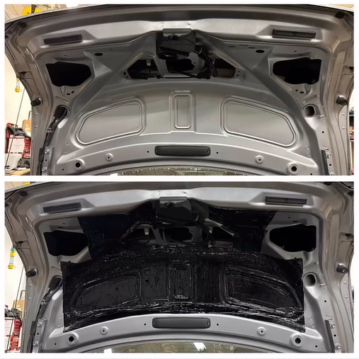 For extra thermal protection apply ½” Silencer Megabond directly on top of HushMat Ultra on the firewall, tunnel and trunk floor for optimum thermal insulating performance. Apply ¼” Silencer Megabond to the back of the headliner for extra insulation from the radiant heat. Call or e-mail us and we can provide you with the best material for these applications. HushMat Ultra is specified to perform at up to 550 degrees F. HushMat Ultra II Hoodliner can also be applied to the engine side of the firewall, hood and front quarter panels.
