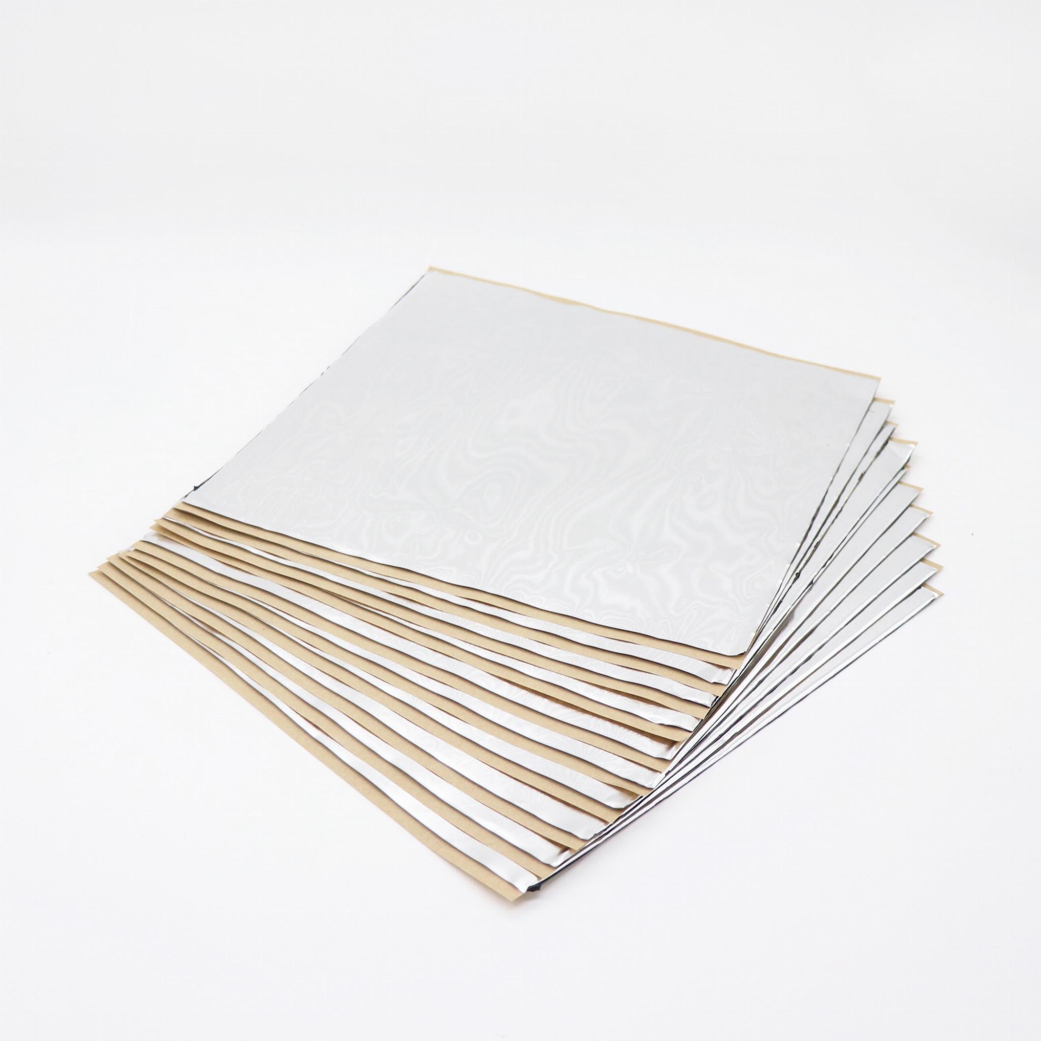 HUSHMAT ULTRA is a pressure-sensitive, constrained-layer damper, which has excellent adhesion to many difficult to bond substrates such as oily cold rolled steel, aluminum, steel, fiberglass, automotive coated surfaces, and many plastics including polypropylene. The aluminum foil constraining layer and specially formulated viscoelastic polymer layer combine to give effective vibration damping over a wide temperature range. Ultra is provided in rectangular or square sheets and can be hand-cut for special configurations.